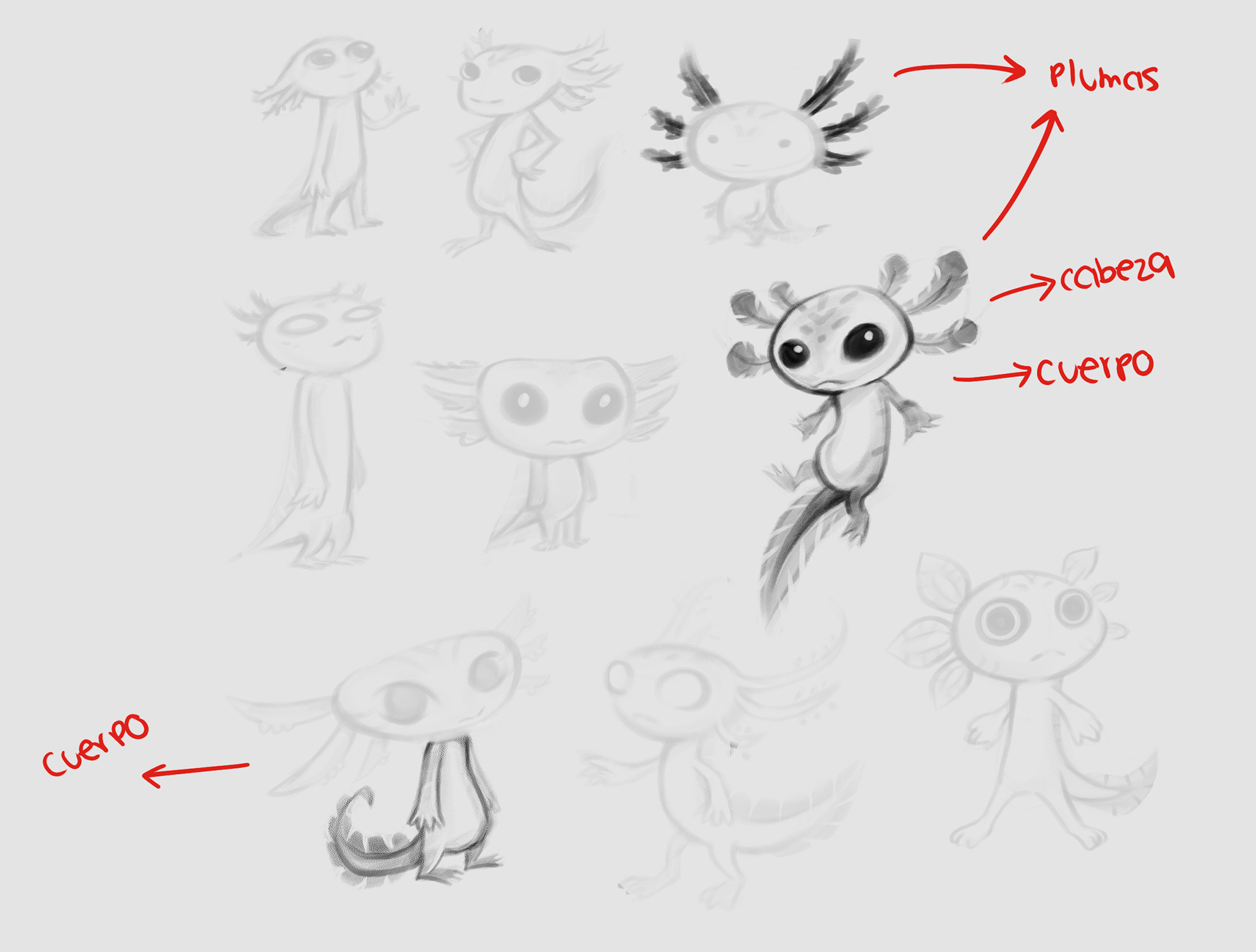 Anthropomorphic axolotl, tender-looking adventurous wizard set in a world inspired by pre-Hispanic culture.